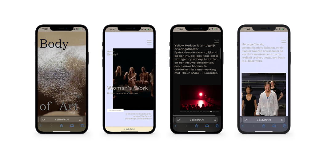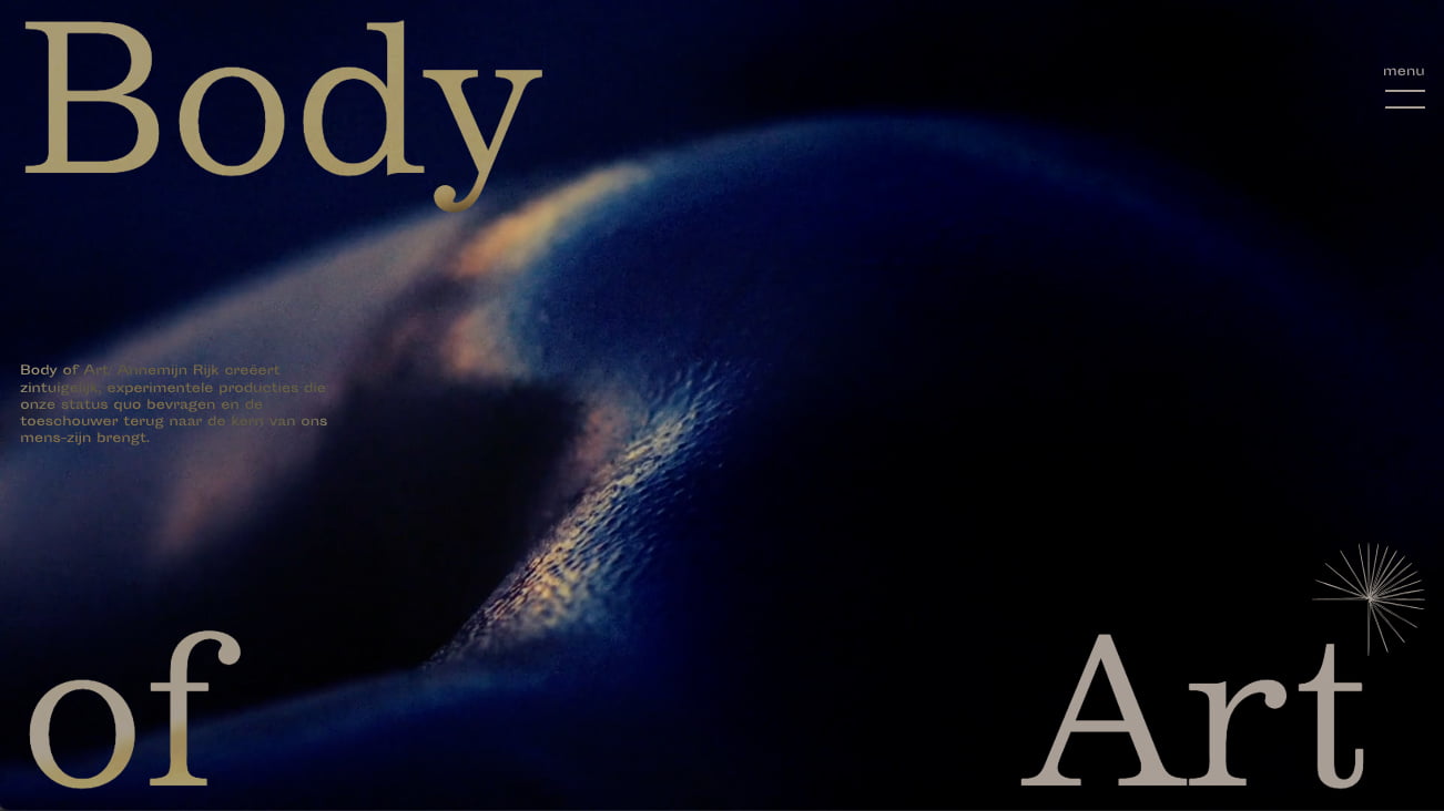 Body of Art/ Annemijn Rijk creëert zintuigelijke, experimentele producties die onze status quo bevragen en de toeschouwer terug naar de kern van ons mens-zijn brengt. In de branding rondom haar performances komt het lichaam op vervreemdende manieren tot leven. Rondom de installaties van Annemijn Rijk ontwikkelden we: storytelling strategy, graphic design performances en webdesign